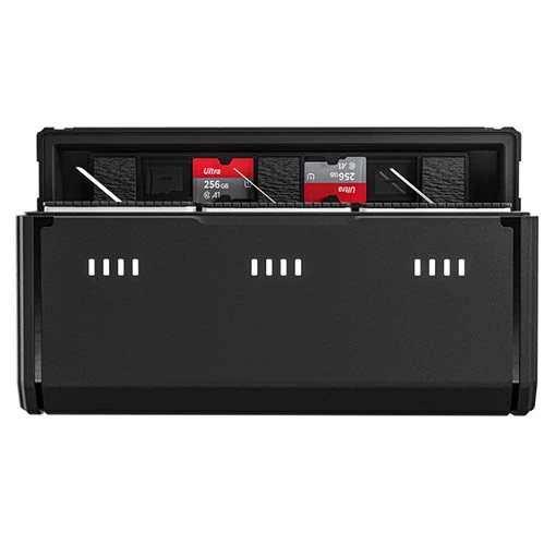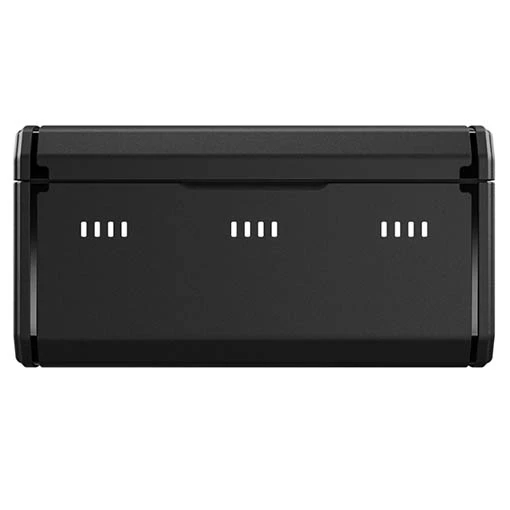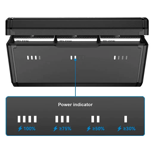 Stockez et chargez 3 batteries pour GoPro HERO12, HERO11, HERO10 et HERO9 simultanément avec ce chargeur triple Telesin. Il effectue une charge complète en seulement 1.5 heure. Le chargeur dispose de 4 affichages lumineux sous forme de petits rectangles sous chaque emplacement de batterie : 1 rectangle allumé signifie que la charge est de 25%, 2 rectangles 50%, 3 rectangles 75% et 4 rectangles 100%. Ce chargeur peut également stocker 2 cartes mémoires (non incluses).