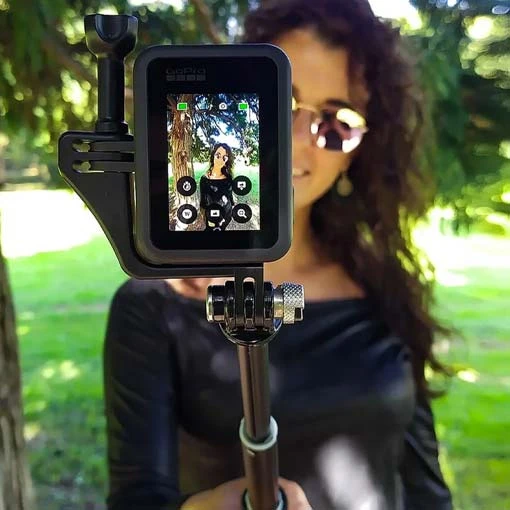 Fixez votre GoPro sur l’adaptateur à l’aide de la fixation standard. Vous pourrez le fixer sur une perche, un trépied ou autres accessoires compatibles. Facile à installer, il laisse libre accès aux boutons de contrôle et écrans.