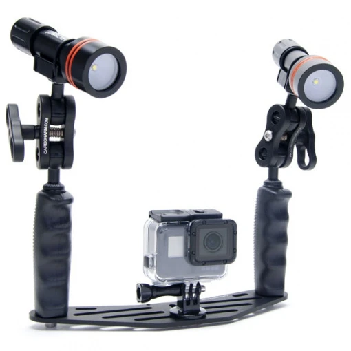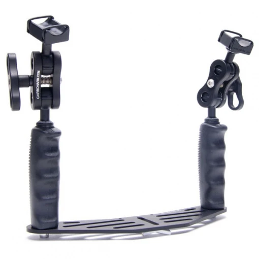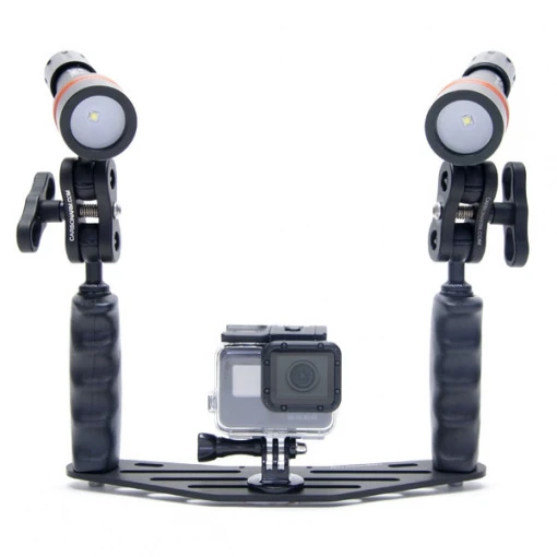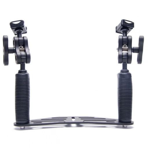 Cette platine de plongée est fabriquée en Italie par CarbonArm. Elle est entièrement usinée dans de l’aluminium anodisé, traité anticorrosion. Ses deux poignées sont très ergonomiques, elles disposent d’un revêtement PVC pour assurer un bon grip. Les deux rotules permettront de supporter votre éclairage. L’adaptateur GoPro et les supports lampes sont inclus.