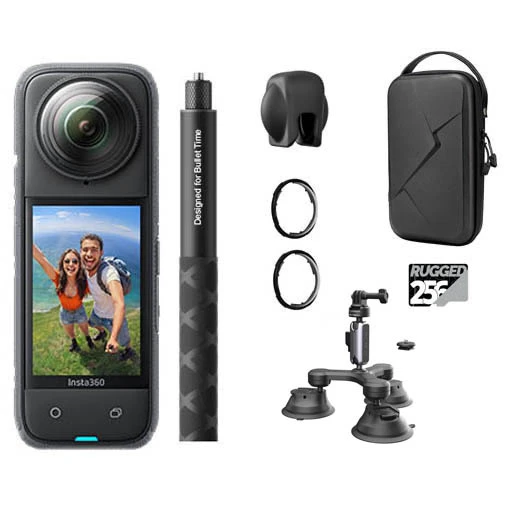 Ce Bundle auto, destiné à la prise de vue véhiculée, est parfait pour les sports automobiles par exemple. Il se compose de la caméra Insta360 X4, d’une perche invisible, d’une ventouse à trois bras CapLock, d’un capuchon d’objectif, de deux lentilles de protection en verre trempé, d’une pochette de transport et d’une carte microSD 256Go. Ses nombreux accessoires sont également très utiles pour protéger votre matériel pendant son stockage et son transport.