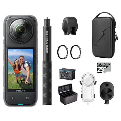 Ce pack Insta360 X4 Bundle ultime est conçu pour répondre à tous vos besoins sur un large type de scénarios. Il se compose de la caméra Insta360 X4, d’une perche invisible, d’un caisson de plongée invisible, d’un Cordon Bullet Time, d’un hub de charge, de deux batteries supplémentaires, d’un capuchon d’objectif, de deux lentilles de protection en verre trempé, d’une pochette de transport et d’une carte microSD 256Go. Les différents accessoires de ce pack vous permettent d’obtenir des images spectaculaires, même sous l’eau jusqu’à 50 mètres !