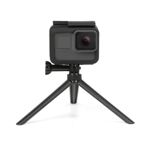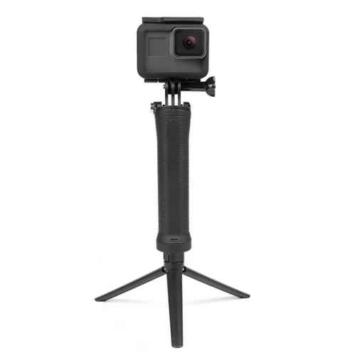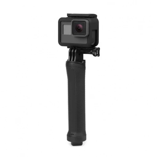Le mini trépied intégré dans la poignée se déploie en un instant. Il est idéal pour poser votre GoPro au sol ou sur une surface plane pour vous filmer quand vous êtes seul ou pour capturer des photos de nuit avec une longue durée d’exposition. En utilisant le trépied plus la perche vous pourrez réhausser votre GoPro par rapport au sol.